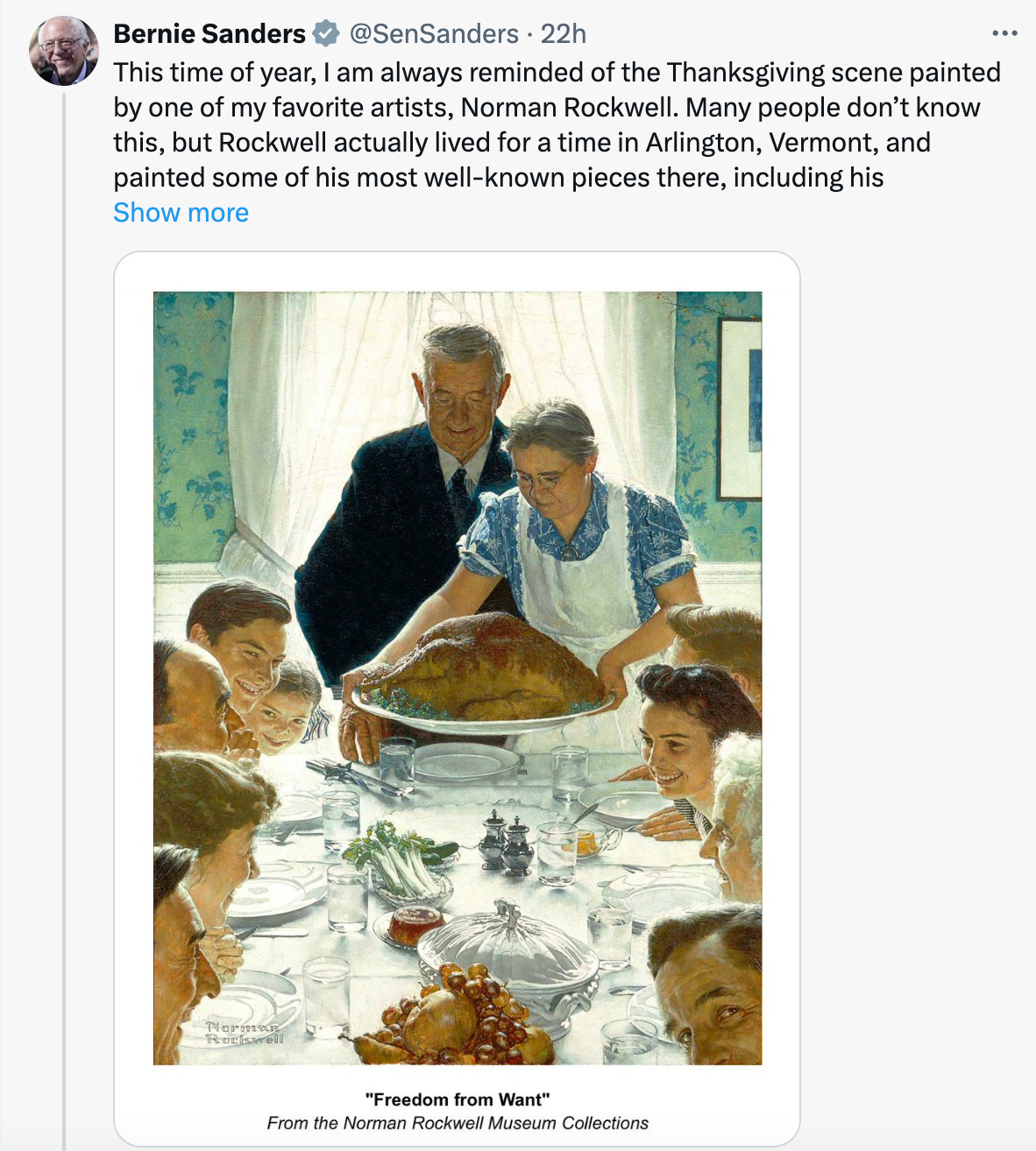 In posting the iconic Norman Rockwell painting, Sanders inadvertently offered a reminder of the failings of his own populist insurgency. His attempt to articulate a distinct economic populist version of “MAGA” was sabotaged by the boutique cultural politics of his coalition, as well as by his own dogged loyalty to the same party establishment he has lately accused of having abandoned the working class. If Sanders had posted the same image during his 2020 run, he would have surely been assailed for the “whiteness,” “heteronormativity” etc. of the depicted family, as well as for celebrating a genocidal holiday, and so on. To the extent Sanders capitulated and lent legitimacy to those who took such positions—and he did, on any number of occasions—he was himself an agent of the abandonment he decries.