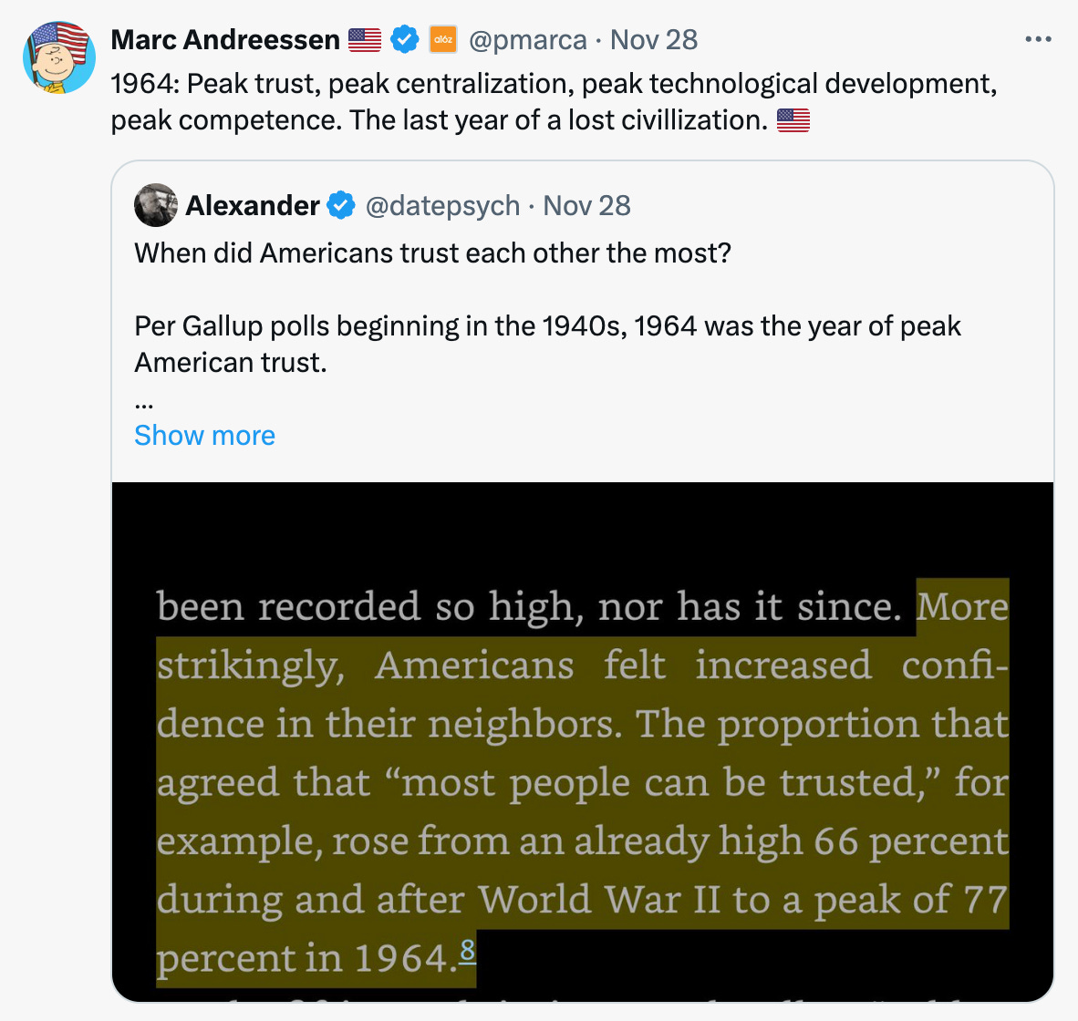 The result is that, for the moment, Trump’s MAGA, and not Bernie’s “political revolution,” has succeeded in appropriating the floating signifiers of midcentury prosperity (see JD Vance’s meme of the same Rockwell image) and turning them into a durable electoral program. The question now is what it will do with that success. Andreessen’s post suggests one version of the agenda to be pursued: the restoration of “peak trust, peak centralization, peak technological development, peak competence.” One imagines, however, Andreessen wouldn’t be in favor of several other things that were at their peak at the time—notably two mentioned earlier, union density and marginal tax rates—and we know DOGE co-chairs Musk and Ramaswamy aren’t.